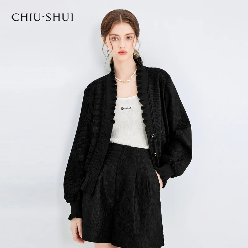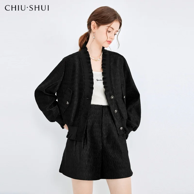 New Women's Black Retro Casual Suit Hooded Button Knee Terry Loose Jacket Shorts Two-Piece Set